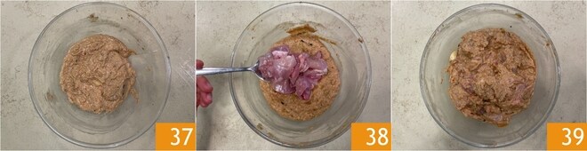 Obtendrás una mezcla de consistencia bastante gruesa 37. En este punto, vierte el pollo en el bol 38 y mezcla bien para que los trozos estén cubiertos de manera uniforme. Cubre con film transparente y deja marinar en el frigorífico al menos durante una hora o, mejor aún, toda la noche 39.