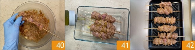 Pasado el tiempo de marinado, puedes montar las brochetas: ensarta los trozos de pollo en 6 pinchos de madera, que habrás dejado en remojo durante unos diez minutos (de este modo no se ennegrecerán). Separa ligeramente los trozos para asegurar una cocción uniforme 40. Una vez montadas, sazona las brochetas con un poco de aceite 41, luego colócalas en una parrilla bien caliente 42.