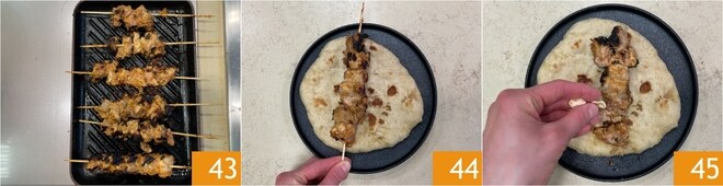 Cocina las brochetas durante 10-15 minutos, dándoles la vuelta a menudo 43. Estás listo para componer el bocadillo: coloca la pita en un plato y coloca una brocheta en el centro 44, luego desliza la carne y añade algunos cacahuetes tostados 45.