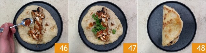 Condimenta con salsa picante al gusto 46, un poco de jugo de lima, algunas rodajas de chile y cilantro fresco, luego dóblala por la mitad 48. Procede de este modo para montar las pitas restantes. ¡Tus brochetas de pollo con pita están listas para ser disfrutadas!