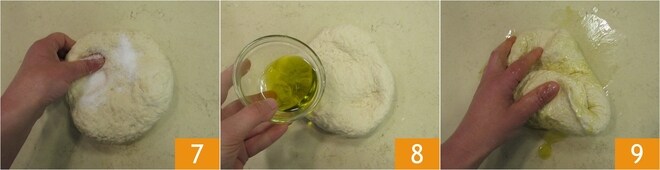 Extiende ligeramente la masa obtenida y añade la sal 7, luego trabaja hasta que ya no sientas los granos bajo los dedos. Después de incorporar la sal, haz lo mismo con el aceite, añadiéndolo en 2-3 veces 8 9.