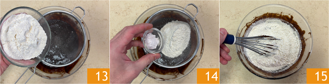 Tamizad en un bol la harina 13 y la levadura 14, luego mezclad nuevamente 15 para incorporar los ingredientes secos de manera uniforme y obtener un compuesto sin grumos.