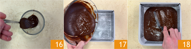 Reservad 40 g de masa para la decoración 16. Verted el resto del compuesto en un molde de 20x20 cm forrado con papel de horno 17, nivelad la superficie 18 y reservad.