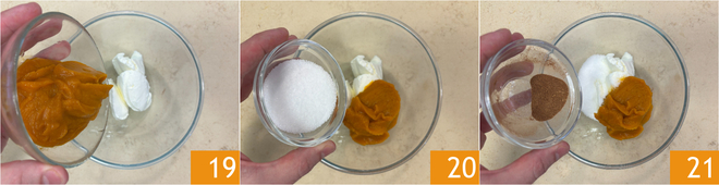 Para preparar la crema de calabaza, combinad en un bol el queso crema, los 160 g restantes de puré de calabaza 19, el azúcar 20 y la mezcla de especias 21.
