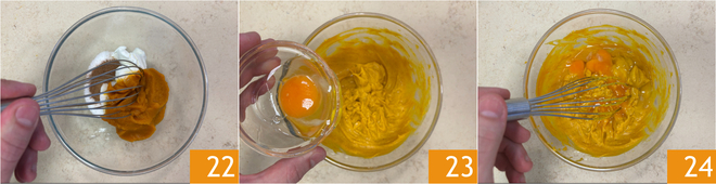 Mezclad todo 22, luego añadid el huevo 23 y mezclad nuevamente para incorporarlo 24.
