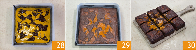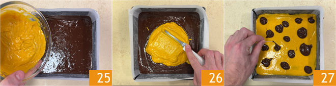 Verted la crema de calabaza en el molde 25 y nivelad para cubrir la capa de chocolate de manera uniforme 26. Ahora coged la masa de brownie reservada y distribuid pequeños montoncitos en la superficie, luego cread el efecto variado con un palillo 27.