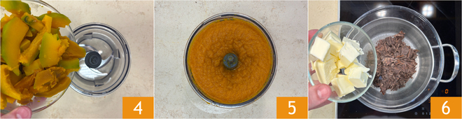 Dejad que se enfríe un poco, luego transferid la calabaza a una batidora 4 y triturad hasta obtener unos 250 g de puré suave y homogéneo 5. Reservad. Ahora dedicad al preparado de los brownies: derretid al baño maría el chocolate con la mantequilla 6.
