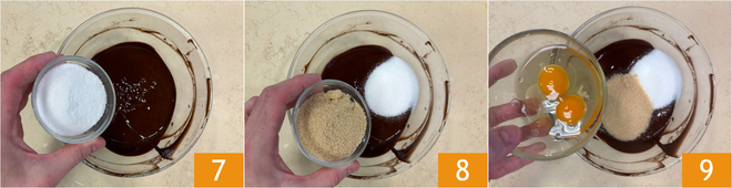 Dejad que se enfríe un poco, luego añadid el azúcar blanco 7, el azúcar moreno 8 y los huevos 9.