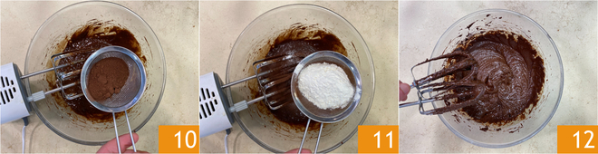 Apaga las varillas y tamiza el cacao 10 y la harina 11. Incorpora los polvos con las varillas hasta obtener una masa brillante y homogénea 12.