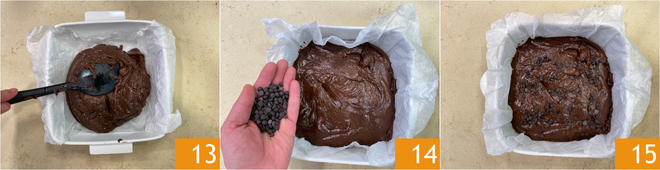 Vierte la mezcla en un molde de 20x20 cm forrado con papel de horno humedecido y escurrido 13. Nivelar la superficie y espolvorear con las pepitas de chocolate 14. Coloca el molde en la cesta de la freidora de aire y cocina durante 30 minutos a 160° en modo repostería 15 (hemos utilizado una freidora con capacidad de 6 litros).