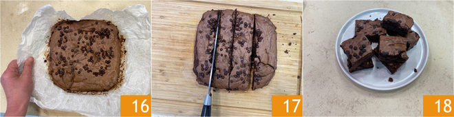 Transcurrido el tiempo de cocción, extrae el dulce 16 y quita el papel de horno. Deja templar, luego corta los brownies en cuadrados 17. ¡Tus brownies en freidora de aire están listos para ser disfrutados solos o con una espolvoreada de azúcar glas 18!