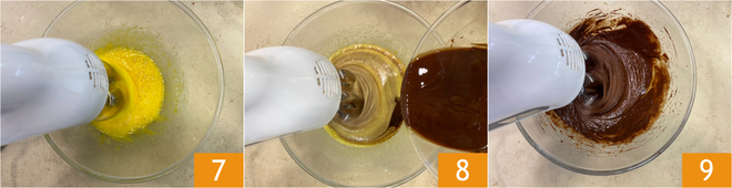 En aproximadamente 10 minutos obtendrás una mezcla clara y espumosa 7, luego une la mezcla de chocolate y mantequilla templada 8 y mezcla durante un par de minutos con las varillas 9.
