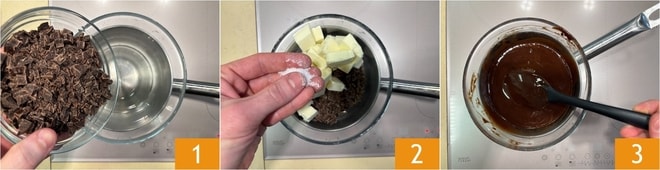 Para preparar los brownies paraíso comienza vertiendo el chocolate picado en un recipiente para baño maría 1. Agrega la mantequilla en trozos y una pizca de sal 2. Remueve de vez en cuando hasta que se derrita por completo 3, luego deja enfriar un poco.