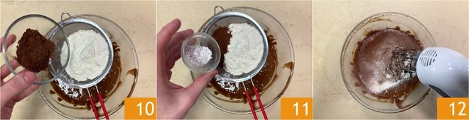 Continúa con el cacao 10 y la levadura 11 y mezcla de nuevo con las varillas eléctricas 12.