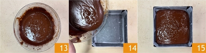 Cuando los ingredientes secos estén bien incorporados 13, engrasa y forra con papel de horno un molde de 25x25 cm, vierte la masa dentro 14 y distribúyela uniformemente con la espátula 15. Hornea en horno estático precalentado a 180° por aproximadamente 30-35 minutos, en la bandeja central.
