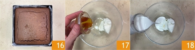 Saca el brownie del horno y deja enfriar un poco 16. Mientras tanto prepara la crema: en un bol vierte el mascarpone, la miel 17 y la nata 18.