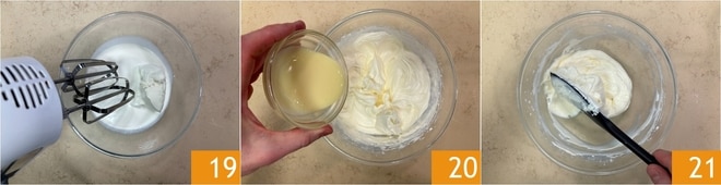 Comienza a batir con las varillas eléctricas 19, luego vierte también la leche condensada 20. Mezcla suavemente con una espátula para incorporarla y reserva 21.