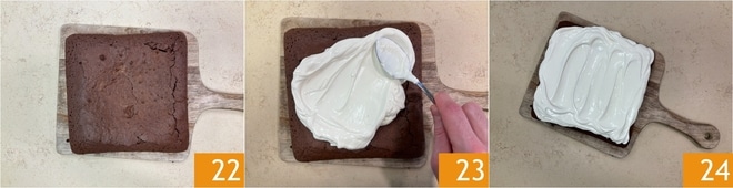 Una vez enfriado, desmolda el dulce sobre una tabla 22, luego cubre la superficie con la crema creando un efecto espatulado con el dorso de una cuchara 23. Coloca en el frigorífico para que enfríe al menos 2 horas 24, luego puedes cortar el dulce en cubos, puedes dividir los brownies paraíso en 9 cubos grandes o en 16 porciones más pequeñas, ¡la elección es tuya!