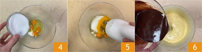 Vierte los huevos en un bol con el azúcar 4, luego bate con las varillas eléctricas 5 hasta obtener una mezcla clara y espumosa. En este punto incorpora el chocolate negro atemperado 6.