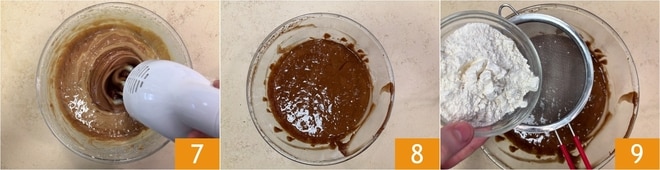 Sigue batiendo con las varillas eléctricas 7 para obtener una masa homogénea 8. Tamiza la harina dentro 9.