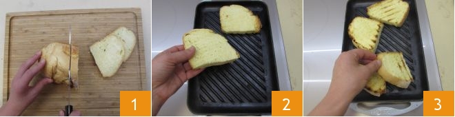 Para preparar la bruschetta de higos y jamón curado dulce, cortad la hogaza de pan en cuatro rebanadas de igual grosor 1. Calentad una parrilla y tostad el pan unos minutos por cada lado (2-3). Reservad las bruschettas.