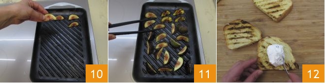 Colocadlos en la parrilla bien caliente 10: cocedlos unos segundos por cada lado teniendo cuidado de darles la vuelta con unas pinzas de cocina 11. Ahora todo está listo para montar las bruschettas. Tomad una rebanada de pan y untad sobre ella la crema de robiola y cebollino 12.