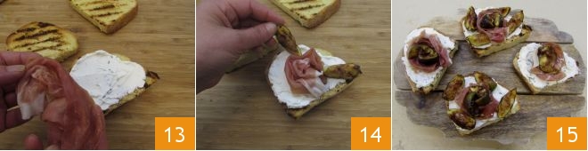 Colocad dos lonchas de jamón curado en el centro de la rebanada de pan 13 y alrededor unas láminas de higo 14. Repetid la operación con las demás rebanadas de pan. ¡Vuestra bruschetta de higos y jamón curado dulce ya está lista para servir 15!