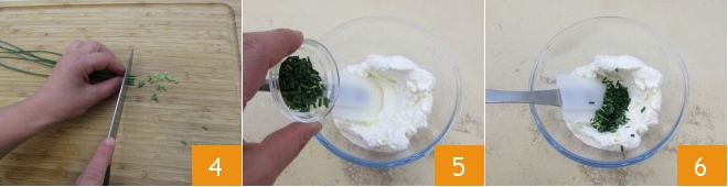 Ahora dedicaos a la crema de queso. Lavad el cebollino y picadlo finamente 4. Incorporadlo en un bol con la robiola 5 y mezclad bien los ingredientes 6.
