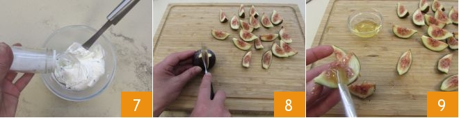 Ajustad de sal y pimienta 7 y reservad. Continuad con la preparación de los higos: enjuagadlos, cortadlos por la mitad y cada mitad en tres partes 8. Pinceladlos con miel por toda la superficie 9.