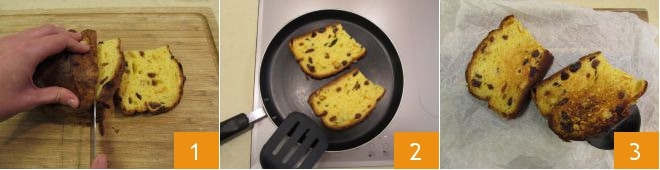 Para preparar las bruschettas de panettone con gorgonzola, primero corta en rebanadas gruesas el panettone que sobró 1. Calienta una parrilla y tuesta las rebanadas de panettone por algunos instantes 2, solo el tiempo necesario para dorarlas 3.