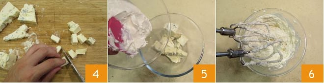 Quita la corteza del gorgonzola, córtalo en cubos y ponlo en un bol, añade también el mascarpone 4 y trabaja los quesos con las varillas eléctricas a baja velocidad para obtener una crema densa 5. Unta la crema sobre las rebanadas de panettone tostadas utilizando una espátula 6.
