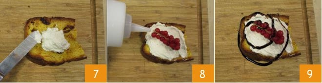 Adorna con las grosellas y la glasa de vinagre balsámico 78. Las bruschettas de panettone con gorgonzola y grosellas están listas para ser disfrutadas 9.