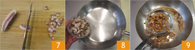 Pasa al guanciale: quita la corteza y córtala primero en rodajas y luego en tiras 7. Coloca el guanciale en una sartén sin añadir más grasa 8 y sofríelo hasta que esté crujiente y dorado. En este punto, retira el guanciale con una espumadera dejando el fondo de la cocción en la sartén 9.