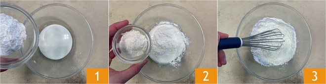 Para preparar el pudín de gianduia con salsa de naranja, verted en un bol la nata, el almidón de maíz 1 y la harina 2, mezclad con la varilla 3.