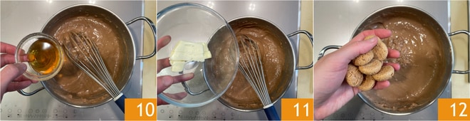 Verted el licor de amaretto 10, luego la mantequilla 11 y dejad que se derrita. En este punto, añadid los amaretti desmenuzados con las manos 12.