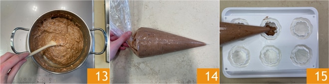 Mezclad de nuevo 13 y luego trasladad la mezcla a una manga pastelera 14, después llenad los moldes de pudín de silicona 15. Las dosis se refieren a 4 moldes de 150 g.