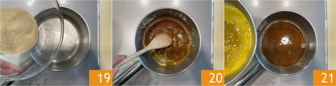 Al mismo tiempo, en otro cazo verted el azúcar moreno 19 y dejad que se derrita a fuego lento 20. Ahora unid el zumo calentado al caramelo en tres veces 21.