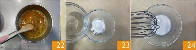 Dejad hervir 22 y mientras tanto, en un bol, unid el almidón y el licor de naranja 23, diluid con la varilla 24
