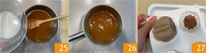 Incorporad el almidón en el caramelo 25, mezclad y dejad enfriar 26. Una vez que los pudines hayan cuajado, desmoldadlos 27 y colocadlos en un plato de servir.