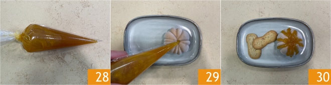 Trasladad la salsa de naranja enfriada a una manga pastelera 28 y decorad los pudines 29, completad con lenguas de gato de pistacho 30