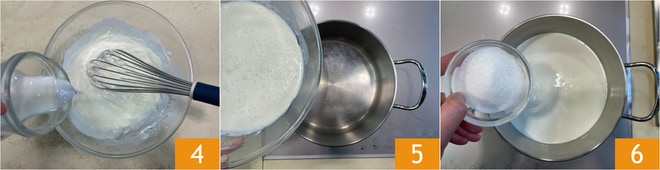 Verted poco a poco la leche, mezclando 4 y luego trasladad la mezcla a un cazo en el fuego 5, añadid el azúcar granulada 6.