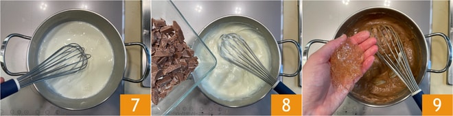Una vez alcanzada la ebullición, cocinad un minuto más, siempre mezclando 7. Luego apagad el fuego y añadid el chocolate gianduia 8, mezclad bien para que se derrita. Incorporad la gelatina previamente hidratada en agua y escurrida 9.
