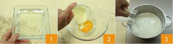 Preparación Para realizar el flan de chocolate poned en un bol con agua fría la gelatina en hojas durante al menos 10 minutos 1. Mientras tanto en un bol batid las yemas con la leche condensada 2, calentad la leche en un cazo a fuego bajo 3
