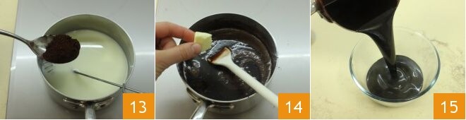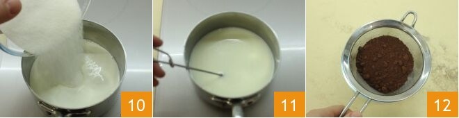 y añadid también el azúcar 10, calentad la mezcla y mezclad para disolver el azúcar 11. Aparte tamizad el cacao amargo 12