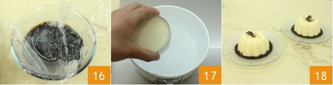 Luego dejad enfriar con una película en contacto para evitar la formación de la película en la superficie 16. Cuando el flan esté bien endurecido podréis desmoldarlo, para facilitaros en esta operación sumergid el molde por unos instantes en una olla con agua caliente 17 y luego dadle la vuelta en el plato de servir, sobre el cual habréis vertido una capa de salsa de chocolate y luego adornad el flan con algunos rizos de chocolate negro 18.