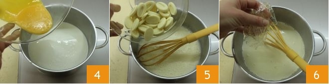 luego verted la mezcla de huevos batidos 4 e incorporad el chocolate blanco 5. Por último, añadid la gelatina en hojas escurrida y bien exprimida 6 y mezclad hasta su completa disolución.
