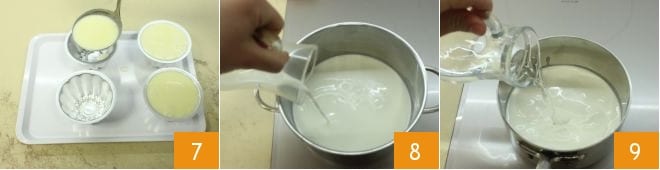 Transferid la mezcla en 4 moldes de capacidad de 250 ml vertiéndola con un cucharón 7 y poned a endurecer los flanes en el frigorífico durante al menos 4 horas. Mientras tanto, preparad la salsa de chocolate negro: en un cazo verted la nata 8, el agua 9,