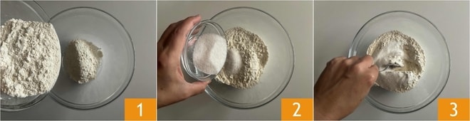 Para preparar el pudín de arroz, comienza con la masa quebrada: vierte la harina en un bol grande 1, añade el azúcar 2 y mezcla 3.