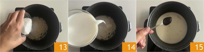 Para preparar la crema de arroz, vierte el arroz en una cacerola 13, añade la leche 14 y el extracto de vainilla 15.