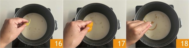 Luego agrega la cáscara de limón 16, de naranja 17 y una pizca de sal 18.